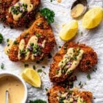 - Serve: Plate the pretzel-crusted chicken and drizzle generously with cheddar-mustard sauce. Garnish with chopped parsley and finely chopped red onion for freshness and color.