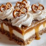These Quick No-Bake Salted Caramel Pretzel Bars combine a crunchy pretzel crust with a rich salted caramel layer, topped with fluffy vanilla whipped cream. Perfect for an easy dessert that requires no oven time and delivers a delicious balance of sweet, salty, and creamy flavors.