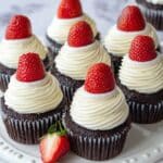 Delightfully festive Santa Hat Cupcakes featuring rich cocoa cupcakes topped with fluffy white chocolate ganache and fresh strawberries to resemble Santa hats. Perfect for holiday celebrations, these moist and tender cupcakes combine a chocolatey base with a creamy, whipped ganache frosting, adorned with strawberries to create a whimsical and delicious seasonal treat.