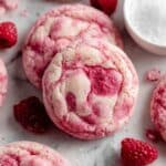 The image shows several soft, round pink cookies with darker pink swirls and chunks, giving them a marbled look. The cookies have a slightly cracked texture on top and look sugary. They are placed on a white marbled surface with a criss-cross pattern underneath. Around the cookies, there are some small fresh raspberries and a small white bowl filled with white granulated sugar. The scene feels fresh and sweet. photo taken with an iphone --ar 4:5 --v 7