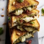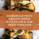 This Sourdough Pesto Grilled Cheese sandwich is a delicious, gooey treat featuring layers of fresh mozzarella, sun-dried tomatoes, crispy bacon, and vibrant pesto between thick slices of sourdough bread, pan-fried to golden perfection for a crispy exterior and melty cheese interior.