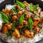 - Serve: Plate the cooked rice and top it with the spiced coconut basil chicken and sauce. Garnish with extra fresh basil if desired and serve immediately.