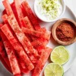 Keywords: spicy watermelon fries, chili lime seasoning, coconut lime sauce, watermelon appetizer, summer snack, fruit fries, dairy dipping sauce