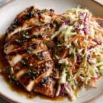 Store leftover chicken and slaw separately in airtight containers in the refrigerator for up to 3 days. Reheat the chicken gently in a skillet over low heat to preserve the glaze’s texture. The slaw is best served fresh but can be enjoyed cold from the fridge; toss it once before serving to redistribute the dressing.