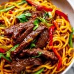 Sticky Beef Noodles are a flavorful and satisfying dish perfect for a quick weeknight dinner. Tender flank steak, crisp vegetables, and chewy noodles come together in a luscious savory sauce that’s sure to please the whole family.