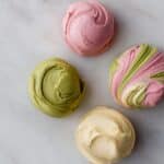 - Shape and Marble the Cookies (Color Block Method): For defined swirls, take about 2 teaspoons of each colored dough and press them side by side—green, pink, and white—into a rough triangle. Stack a second set on top in the same order. Gently roll the stack into a ball and twist it once or twice to create a swirl. Place the dough ball onto a parchment-lined baking sheet and press down firmly with your palm to flatten and reveal the swirl.
