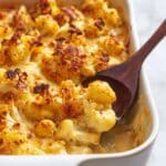 Keywords: cauliflower mac and cheese, low carb mac and cheese, cheesy cauliflower, roasted cauliflower, vegetarian side dish