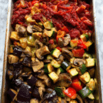 - Prepare Vegetables: Place all the sliced and chopped vegetables (onions, zucchini, eggplant, bell peppers, potatoes, mushrooms) into a large roasting pan, ensuring there is enough space for even cooking and tossing.