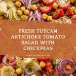 A fresh and vibrant Tuscan Artichoke Tomato Salad featuring cherry tomatoes, marinated artichoke hearts, chickpeas, and fresh herbs tossed in a zesty red wine vinaigrette. Perfect as a light lunch, side dish, or a flavorful addition to any meal.
