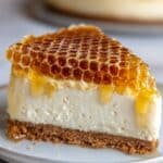6. Top & Serve: Just before serving, gently place chunks of fresh honeycomb on top of the chilled cheesecake. Drizzle with extra honey if desired and sprinkle a tiny amount of dried lavender buds or lemon zest for a beautiful and aromatic garnish.
