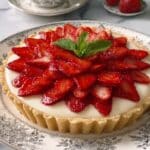 A delightful Vanilla Custard & Strawberry Tart featuring a buttery homemade crust, smooth vanilla custard filling, and fresh strawberries glazed with apricot jam for a beautiful and tasty dessert.