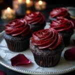 Wednesday Morticia’s Midnight Rose Garden Cupcakes Delight are decadent chocolate cupcakes with a gothic twist, featuring a moist cocoa-infused batter, rich chocolate frosting, and adorned with edible glitter and fresh or sugar roses for an enchanting presentation perfect for themed parties or elegant dessert tables.